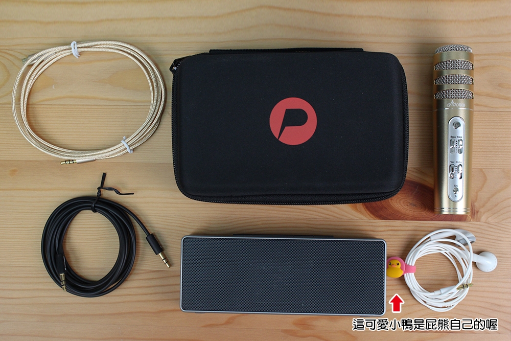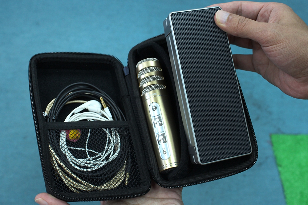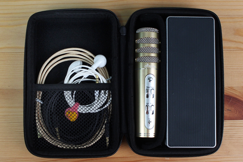 一打開,所有設備一應俱全, idol K8 PLUS 麥克風、藍牙隨身音箱、 輕巧隨身收納包、專用音源線、3.5mm(公對公)立體聲音源線、耳掛式 k 歌專用耳機、 USB充電線。