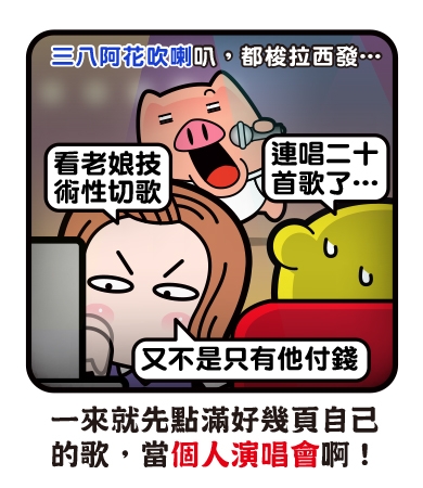 到 KTV 唱歌,大家都有個小小的默契,就是一個人大概都會唱個 1-2 首就會再換下個人,偏偏有人就把 KTV 當自己的演唱會,一同去的親朋好友當成觀眾一樣,連唱了幾首歌後,還在懷疑自己點的怎麼還沒出來,結果一看電腦,差點昏倒,滿滿都是台上那個「主角」點的,而且好幾首還是「插撥」的!真想學 Angel 來個技術性的切歌!
