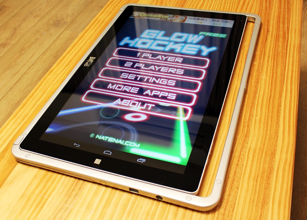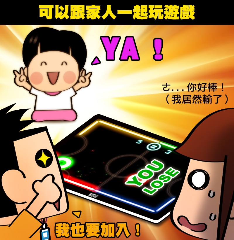 當整個放平時就可以玩像外面遊樂場的遊戲,這裡很推薦在 Google Play 商店下載 Glow Hockey 這個遊戲,和小寶貝對戰時,選擇 2 Players 就對了!