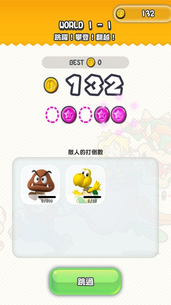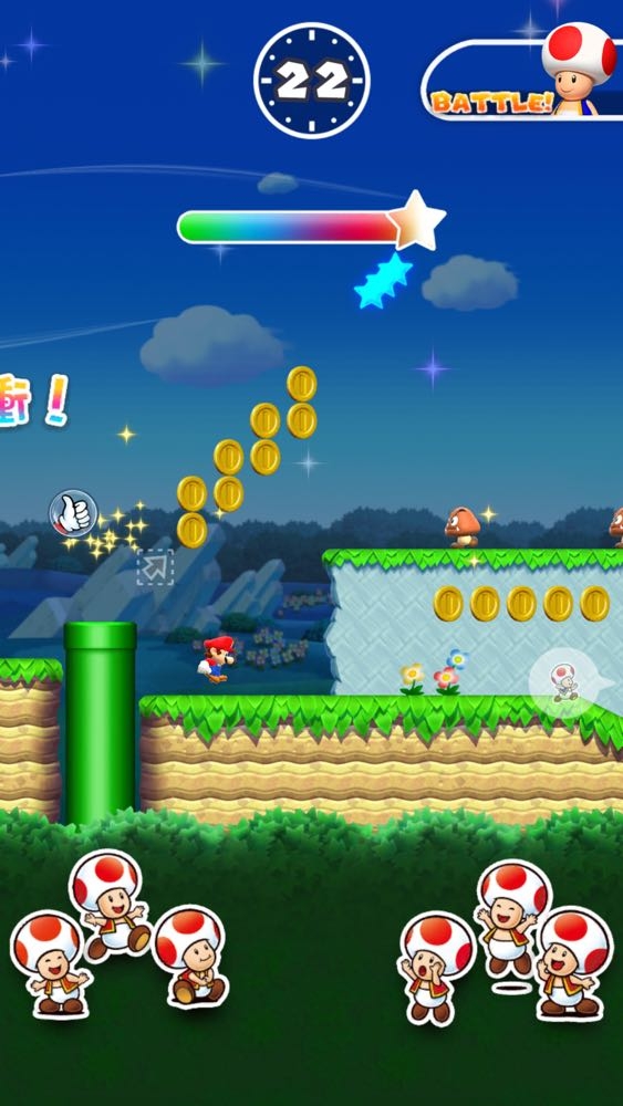 《Super Mario Run》雖說是款需要 NT300 的付費遊戲,但也提供玩家 3 個免費的關卡進行體驗。而遊戲中分為一般的過關關卡- 世界巡迴 (World Tour) 與能夠挑選對象進行對戰的奇諾比奧拉力賽 (Toad Rally),在 (Toad Rally) 中除了有競賽的刺激感受以外,還能贏取 (或是輸光) 遊戲金幣。