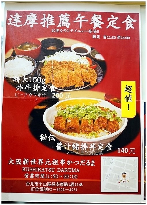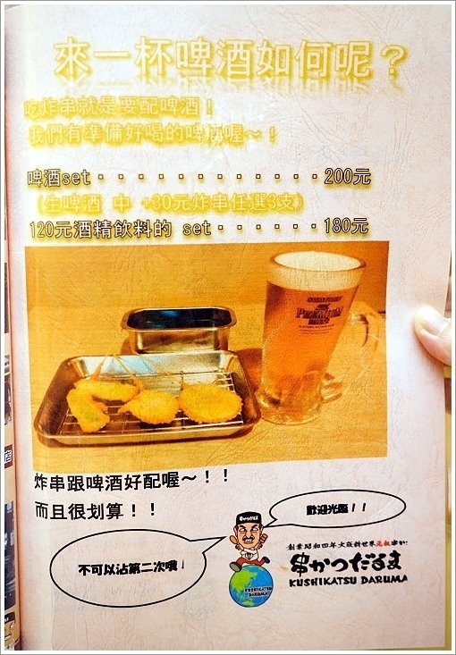 大口去了好幾趟的大阪,一直都沒機會吃到知名的庶民小吃串炸,對於這個名詞既新鮮又好奇,這次總算有機會可以來一償宿願啦!「串炸Kushikatsu Daruma 串カツだるま(串炸達摩)」台北店就位於台北市中山區長安東路一段、天津街交叉路口,創立於昭和四年(民國18年)的串炸達摩,也是串炸料理的始祖,一直都是大阪的排隊名店,現在免出國只要到台北就能享用得到,真是太開心了!串炸的價位落在20~60元不等,另外也有套餐及午餐定食可供點選,第一次來的朋友建議可以先點套餐品嚐看看,喜歡的話之後再加點其他的食材享用!來到這裡,一定要上來一杯啤酒搭配串炸一起享用,不僅相當合拍而且還有濃濃的日本味呢!(未滿十八歲請勿飲酒)