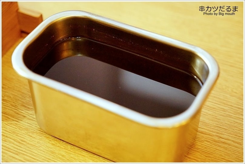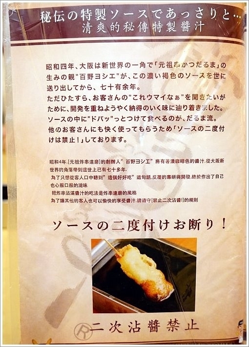 ▼串炸搭配的正是店內秘傳特製醬汁,沾醬對於台灣人來說或許很普遍,但對日本人來說可是相當新奇的事情,而為了能讓更多人可以享用美味的串炸與醬汁,所以特別規定「二次沾醬禁止」,也就是串炸只能沾附一次的醬料啦!對於很愛重覆沾附醬料的台灣人來說真的需要習慣一下,這樣大家的口水也才不會混來混去啦!