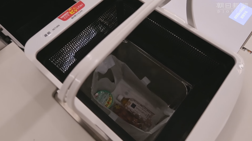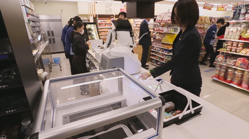 根據日本朝日新聞社所上傳的影片,我們可以看到 Lawson 的結帳方式和 Amazon GO 是有著明顯的不同。消費者在將想要購買的商品放入籃中時,必須先利用籃子側邊的掃描器來對商品進行掃描與計算。到了結帳櫃檯,只需要將籃子放在上方,便會利用裝置為購物籃中的商品做金額結算,消費者只需要透過旁邊的信用卡機來完成結帳的動作,同時機器也會將籃子收回換上塑膠袋,消費者在拿完收據後就能輕鬆的拎著袋子離開。