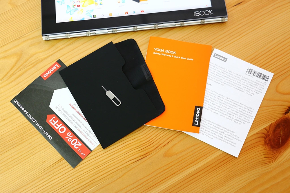 盒內除了 Yoga Book 筆電本體之外,另外包含了拭鏡布、使用說明與保固卡,其中退卡針可以用來打開 micro SD 卡插槽。