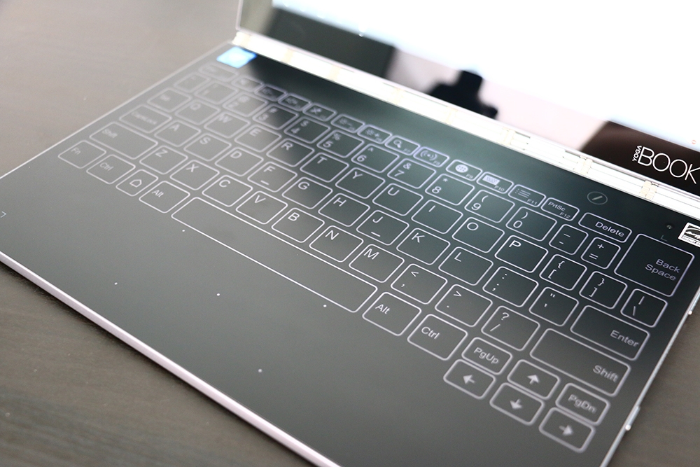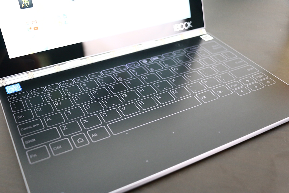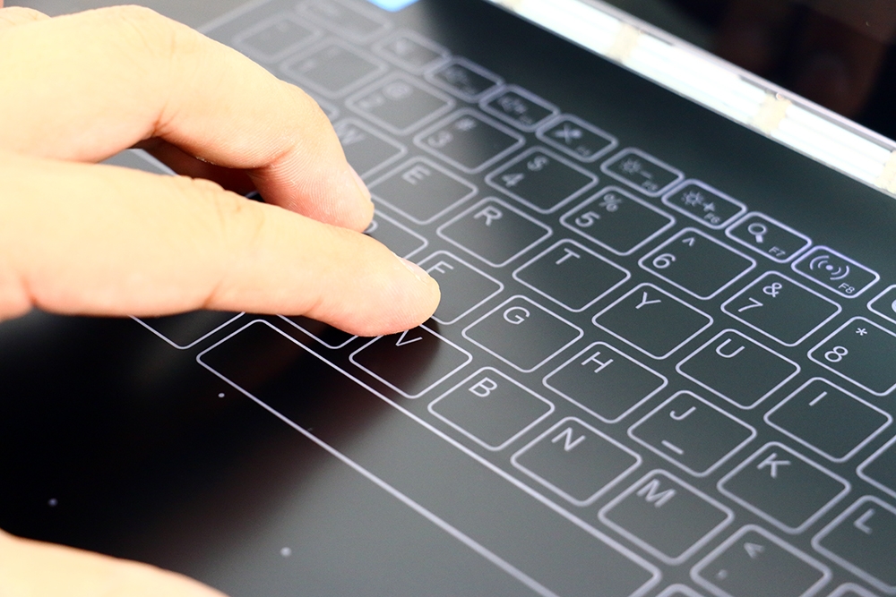 若需要使用鍵盤時我們可以進行切換,進行 Yoga Book 的打字模式時有著全尺寸鍵盤配置,按鍵邊緣有白色的鍵盤背光,打字時會有震動的回饋。這樣的鍵盤打起來無聲,非常適合在圖書館與開會時使用。