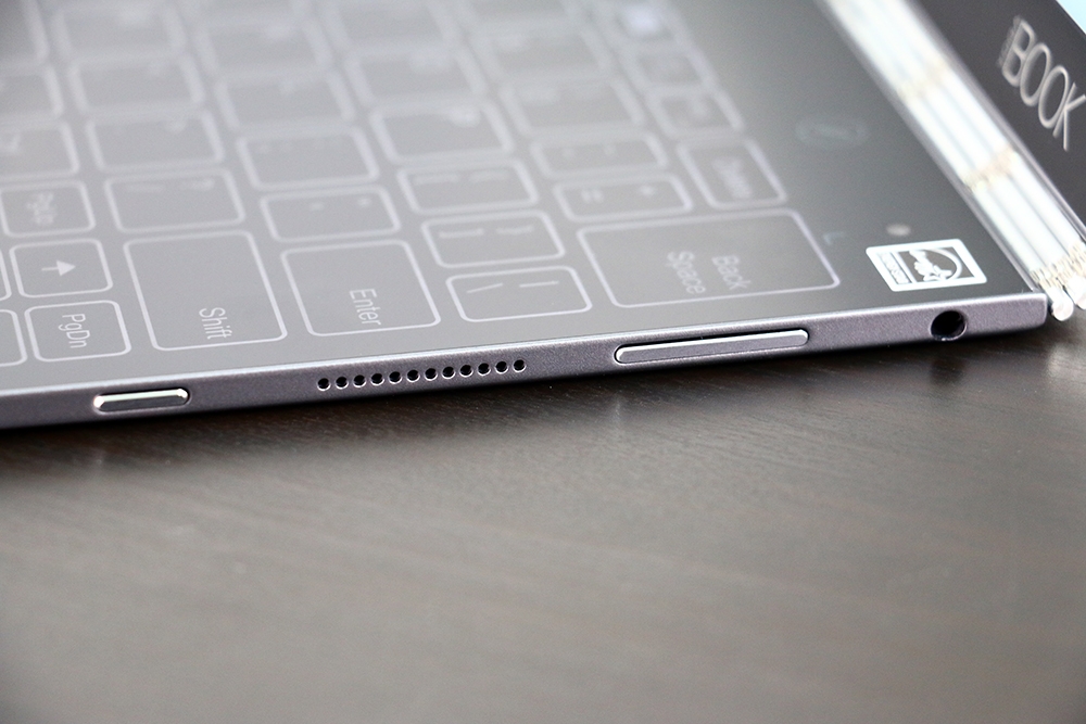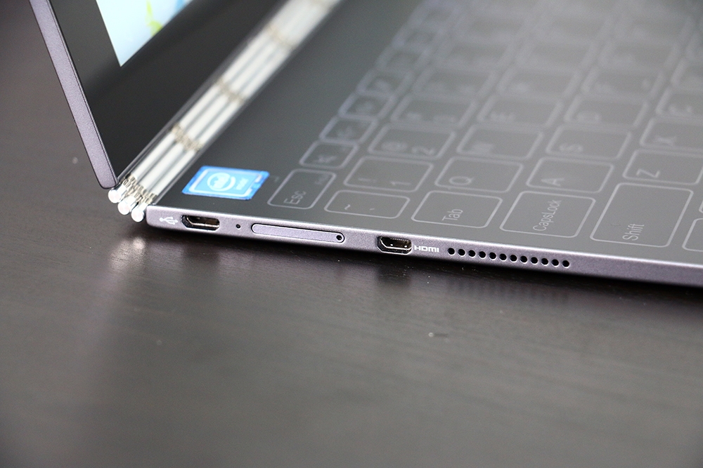 Lenovo Yoga Book 左側有 micro USB 、micro SD 記憶卡插槽以及 micro HDMI,最右邊則是喇叭孔。