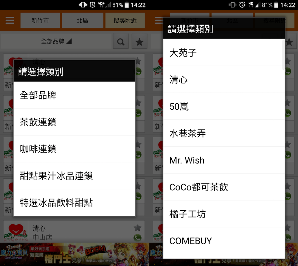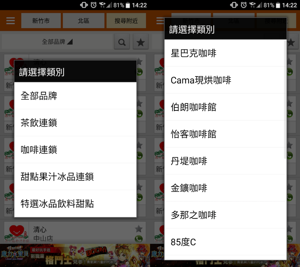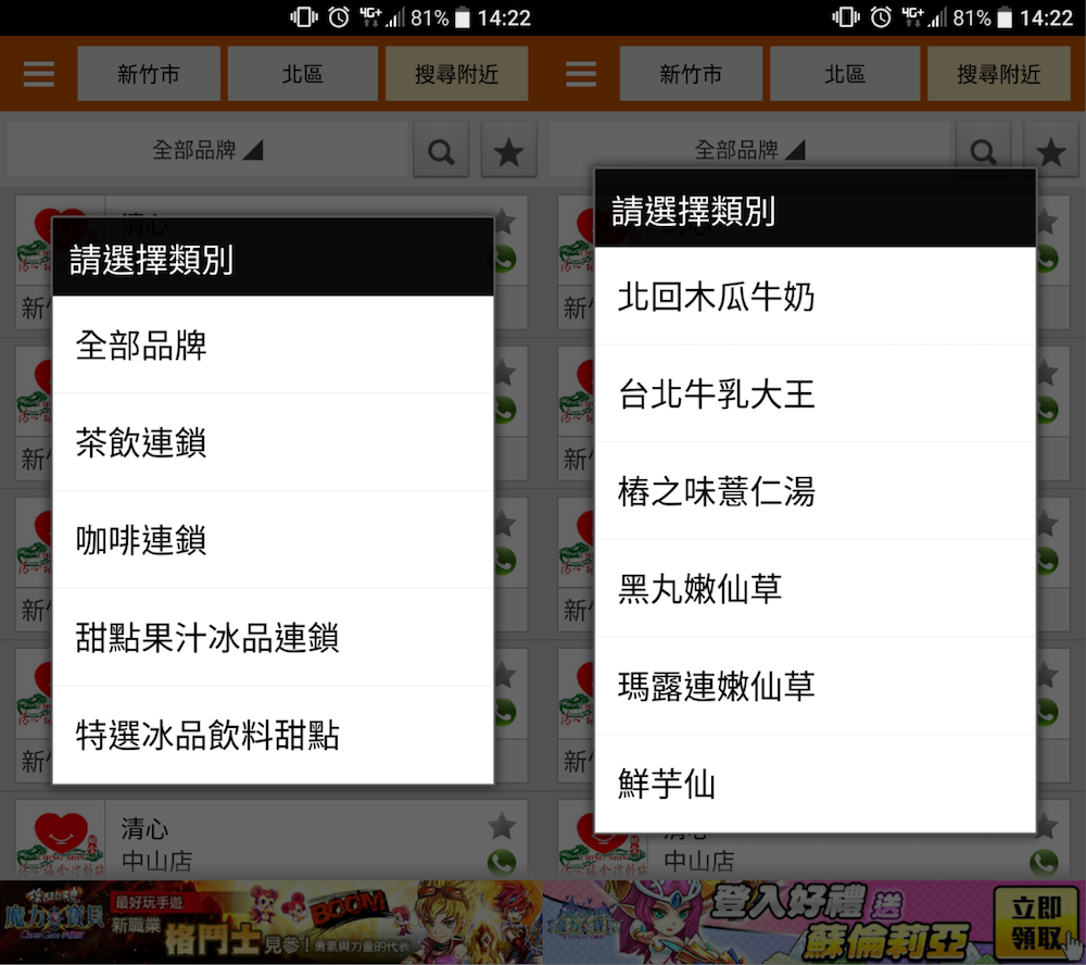 若只想找單一飲料店,也可以點選搜尋項目中的搜尋類別,食在好茶 App 就會列出茶飲連鎖品牌、咖啡連鎖品牌、甜點果汁冰品連鎖品牌等各種細項,讓使用者可以更容易的找到自己常喝的單一品牌飲料店。