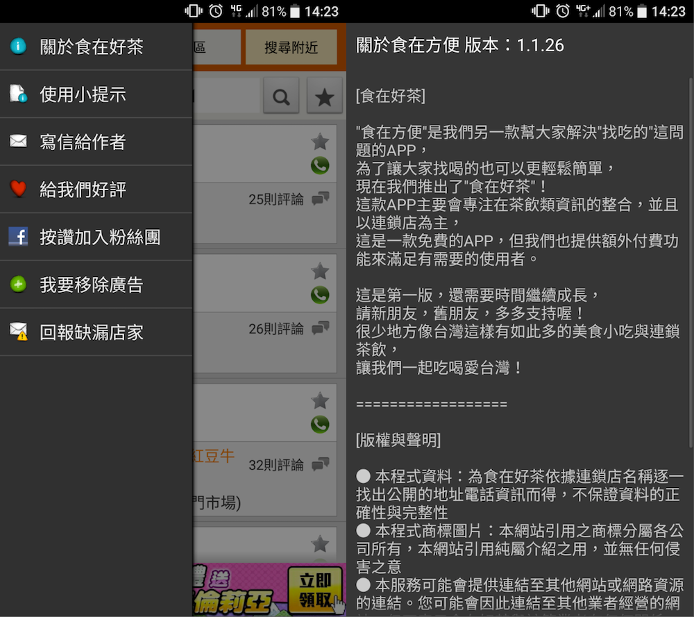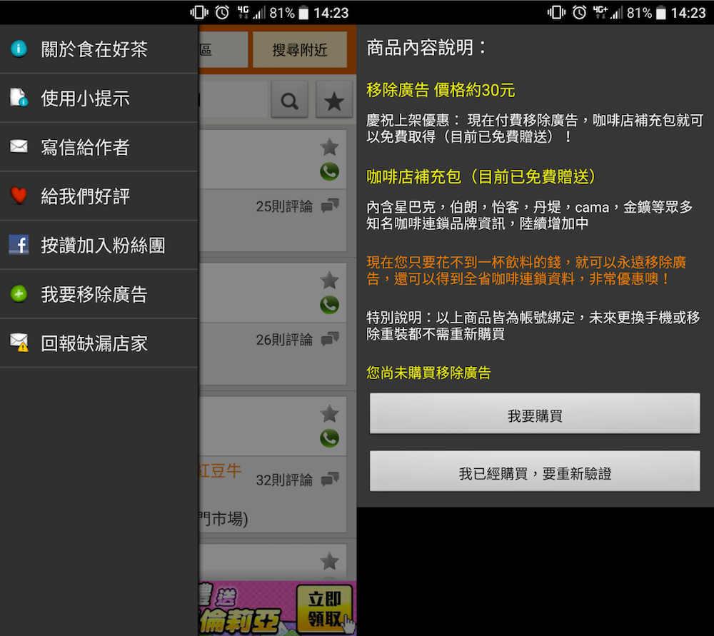 由於食在好茶 App 是一款免費的 App,使用過程出現廣告是相當正常的事情,如果使用者不喜歡在使用的過程中出現廣告,也可以花費 30 元購買無廣告版,除了讓整個 App 介面變得更乾淨外,也是給 App 開發商的一種鼓勵與支持,讓開發商有更多資金去開發更多實用的 App。