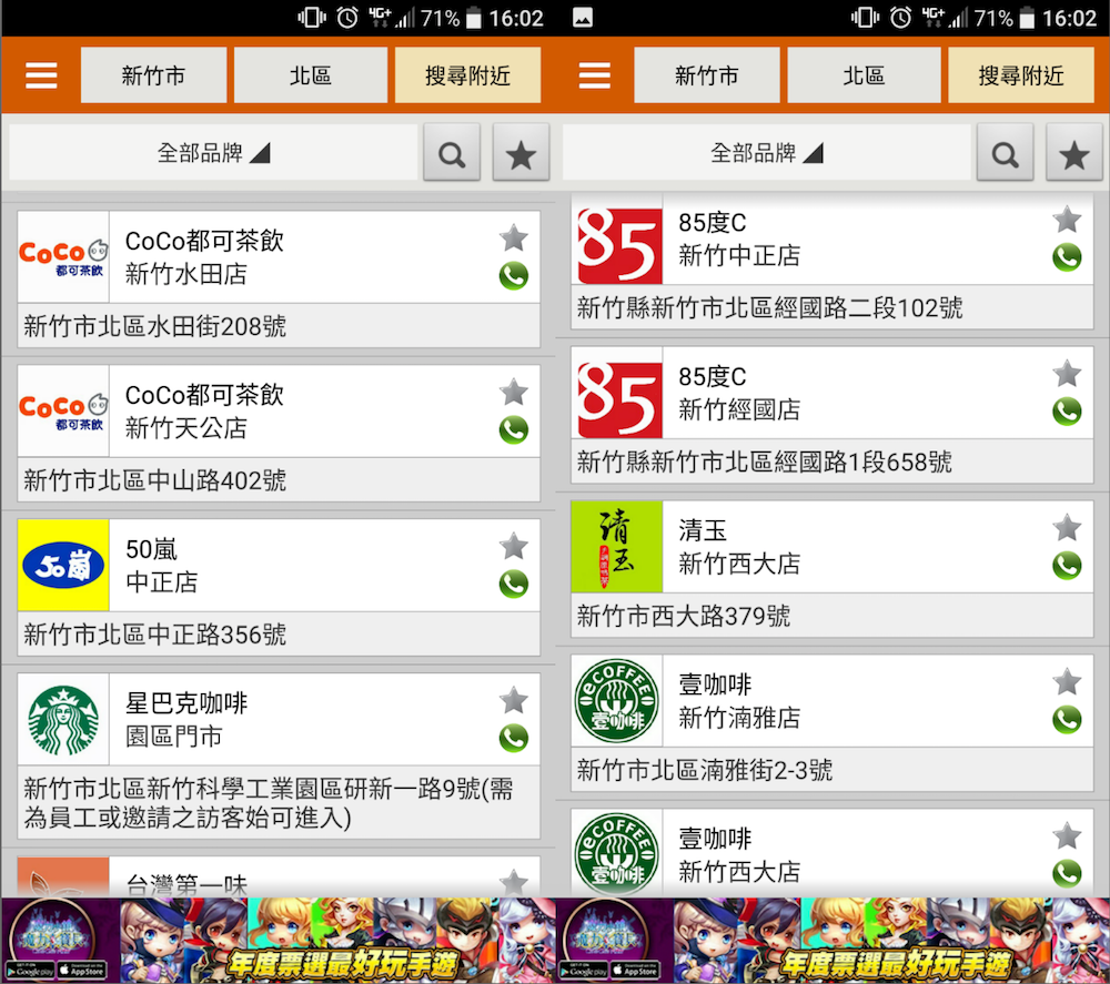 當使用者透過所在城市、品牌進行搜尋後,食在好茶 App 就會列出符合使用者搜尋條件的店家。而食在好茶 App 除了會列出飲料店品牌與圖示之外,還會列出詳細的店家地址,讓使用者可以直接前往自己常喝的飲料店或是前往距離自己最近的店家。