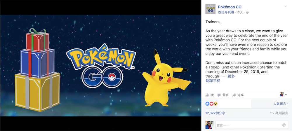 為了慶祝聖誕節以及 2017 新年的到來,以及讓所有玩家都能享受濃濃的過節氣氛,Pokémon Go (精靈寶可夢 Go) 特別在 12 月 25 日至明年的 1 月 3 日之間,舉辦 Pokémon Go (精靈寶可夢 Go) 聖誕迎新活動,活動期間除了櫻花時間從原有的半小時加長為 1 個小時外,還會天天贈送一個一次性孵化器,讓 Pokémon Go (精靈寶可夢 Go) 陪著玩家瘋聖誕、迎跨年。