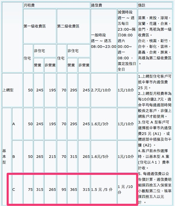 基本 C 型:適用每月市話通話 1620 分鐘以上用量之用戶,每月市話帳單金額 570 元以上者。