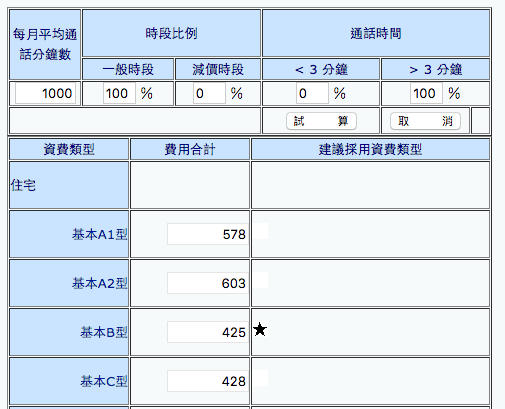 所以如果想要知道怎麼樣才是對自己最划算的,中華電信官網都有提供試算 ( http://www.cht.com.tw/personal/basic-calls-rate-cal.html ) 的服務。我們只要輸入每個月的通話時間、時段比例等,便會自動幫我們試算出最適合我們的費率。