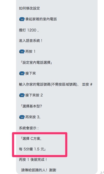 再仔細一看,那則「好康」簡訊,最後的部分,也很清楚,但相信許多人看到最後也不會想要仔細看的,就是告訴你請你將費率改成 C 方案。