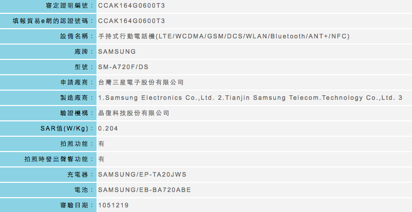 根據 NCC 認證的資料文件中,我們可以確定這款 Galaxy A7 (2017) 會有 32GB 容量、支援台灣 4G 全頻段、NFC,以及使用 Type C 的充電介面。