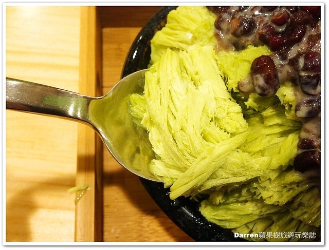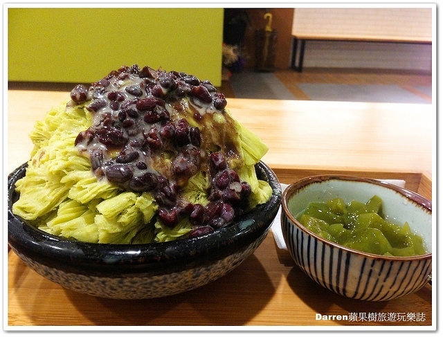 有抹茶雪花冰加上紅豆及煉乳,旁邊還有口感蠻Q的抹茶凍