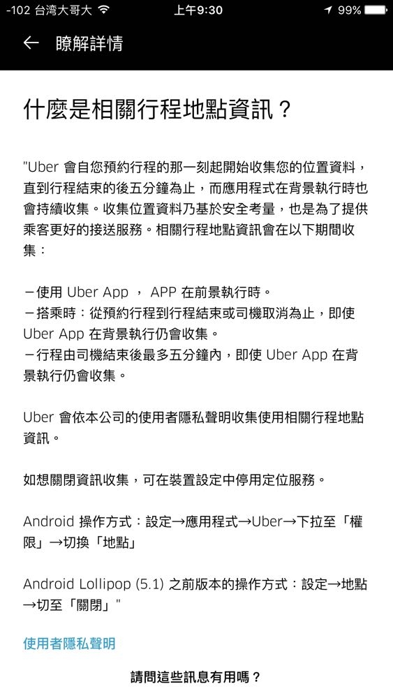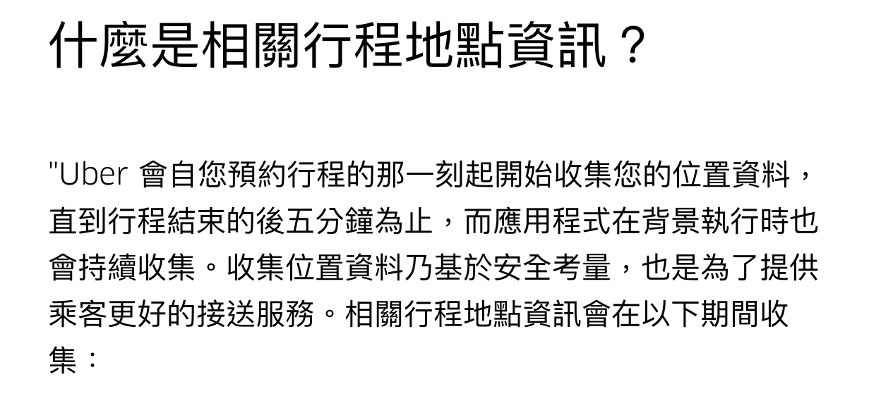 這項說明其實就在「幫助」>>> 「開始使用」>>>「法律和隱私」中的「什麼是相關行程地點資訊」之中,只要點進去便能清楚看到這項說明,這表示 Uber 將會在乘客已經結束行程,也就是抵達目的地後的 5 分鐘持續追蹤乘客的位置。