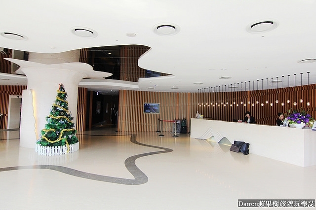 大廳也是充滿海洋流線的線條,極簡白色讓大廳在視覺上寬敞又氣派,白色櫃台下方也有像徵海浪的波浪紋