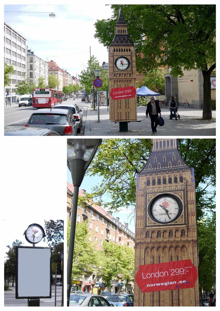 為了激發消費者想外出旅遊的渴望,挪威廉航還直接將倫敦的著名景點「大笨鐘」搬到街道上!挪威廉航改造原先平凡無奇的街鐘,搖身一變成為倫敦的必訪景點,上頭還有醒目的超低優惠價格,在熙來攘往的街道上頭,日以繼夜地刺激行人的好奇心與慾望!