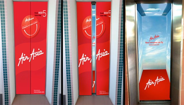 例如亞洲航空,過去就曾將廣告腦筋動到電梯裏頭去,利用電梯全面包覆的封閉空間,創造出藍天白雲環繞在身邊的場景,就像搭飛機時,窗戶外那一望無際的天空一般。只要電梯門一開,消費者彷彿進入另一個世界,在日常的移動軌跡中,讓消費者體會拋開瑣事,飛上天際準備出遊的心情。