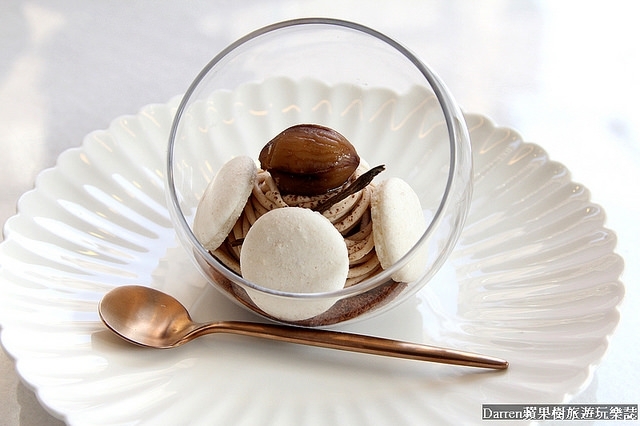栗子蒙布朗,外觀很好看的甜點!!連湯匙都有點玫瑰金,我真得太容易被外觀吸引了