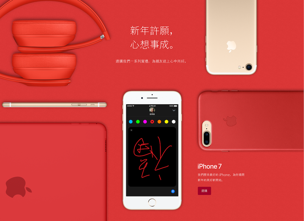 根據 Apple 官網的活動內容表示,為了讓使用者能拿著新產品開心過好年,Apple 官方特別舉辦「過新年,聽新 Beats」的活動,只要在 1 月 6 日上午 8 點後於 Apple 官網購買指定商品,即可立刻獲得價值 NT$ 9,900 元的 Beats Solo 3 Wireless 耳罩式耳機一只,數量有限,送完為止。除了 1 月 6 日的「過新年,聽新 Beats」活動外,Apple 官網也推出「新年賀禮」的活動頁面,推出一系列採用紅色、金色配色的週邊配件,iPhone 7/7 Plus、iPad、Apple Watch 等產品配件應有盡有,