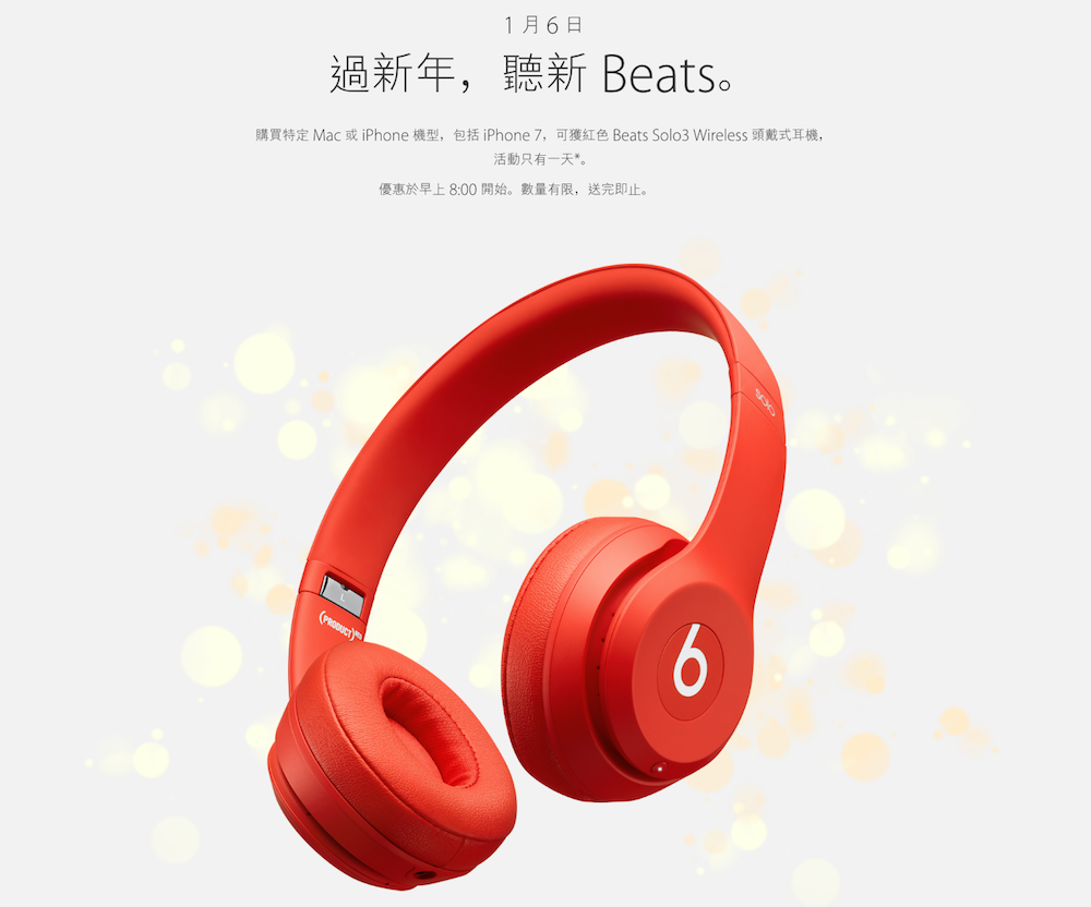 恭賀新禧、新年快樂,為了迎接雞年的到來,Apple 特別在官方網站上公布中國、香港、新加玻、台灣四地獨家活動,凡是在 1 月 6 日當天,在 Apple 官網購買 Apple 指定商品,即可立刻獲得價值 NT$9,900 元的 Beats Solo 3 Wireless 耳罩式耳機一只,數量有限,送完為止。