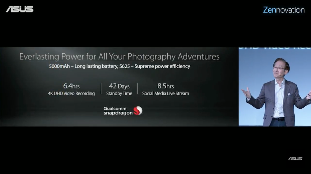 其它硬體規格方面,ASUS ZenFone 3 Zoom 採用亮度高達 500 Nit 的 5.5 吋 AMOLED 螢幕,螢幕上方覆蓋一層康寧第五代大猩猩玻璃。處理器方面,ZenFone 3 Zoom 搭載的是高通 Snapdragon 625 處理器,內建 5000mAh 大容量電池。根據 ASUS 官方數據表示,4K 解析度的影片,大約可連續播放 6.4 個小時,連續使用時間大約 8.5 個小時,而待機時間則是驚人的 42 天,續航力表現相當出色。