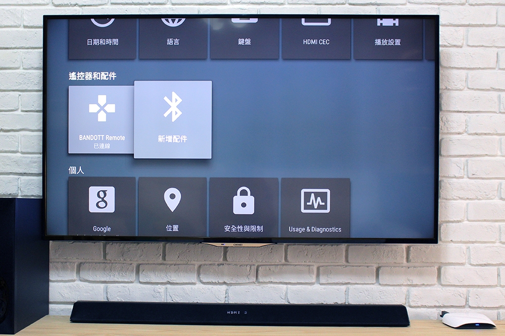 要怎麼好好使用 BANDOTT 來快樂地欣賞線上影音內容,這裡就實際操控給大家看看,接好電源以及將 HDMI 線串接機上盒的「HDMI OUT」和電視就可以開始了。首先是讓藍牙遙控器和電視進行配對,這裡就照著電視的指示來做。