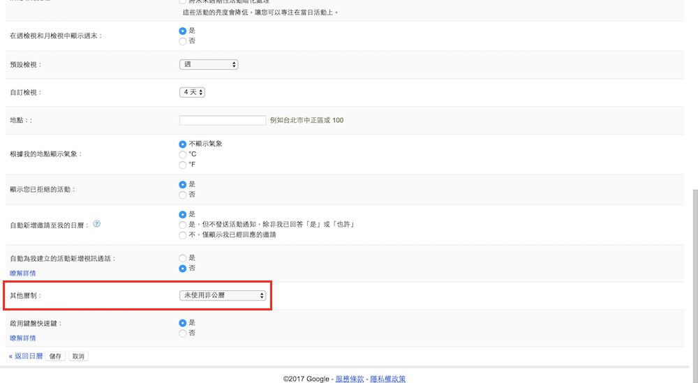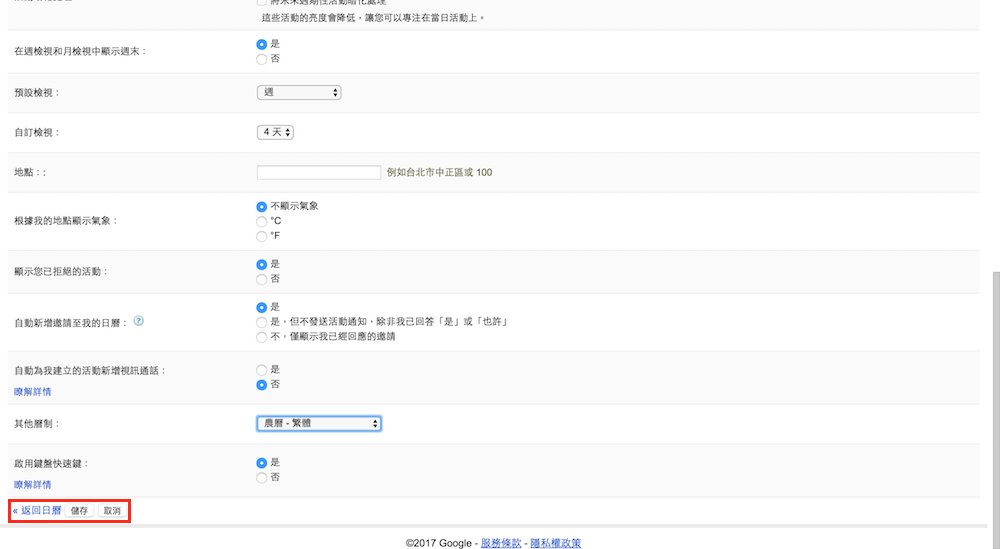 Google 日曆的任何設定,完成後都務必要點選設定頁面最下面的「儲存」按鍵,如果沒儲存的話,以上設定的內容都會無效。
