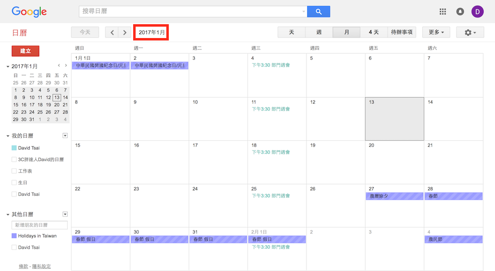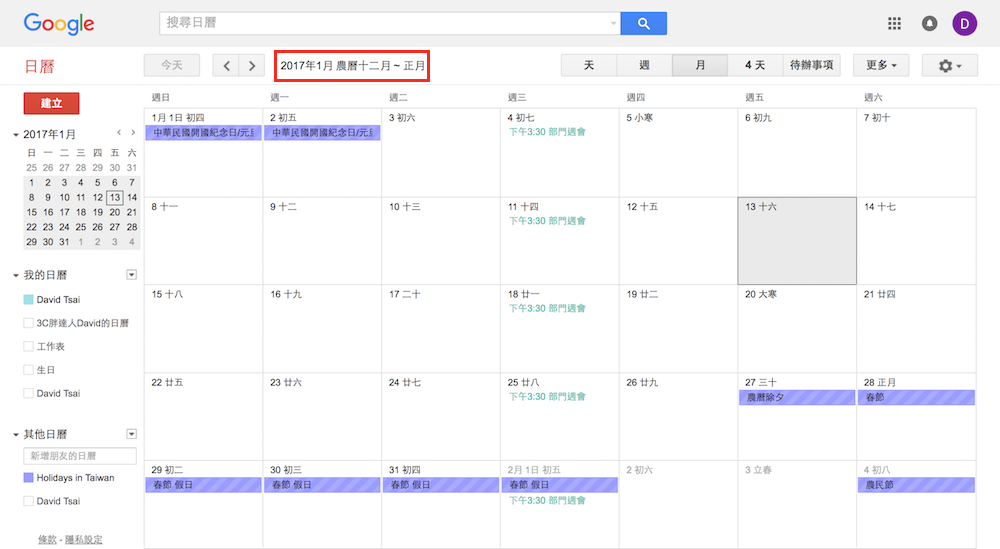 儲存所有設定之後,即可在 Google 日曆上方的日期旁邊看到農曆的顯示。若沒顯示出農曆,請回到第二步重新設定。