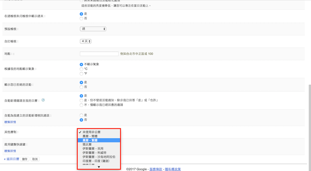 第三步 – 進入 Google 日曆後找到「其他曆制」