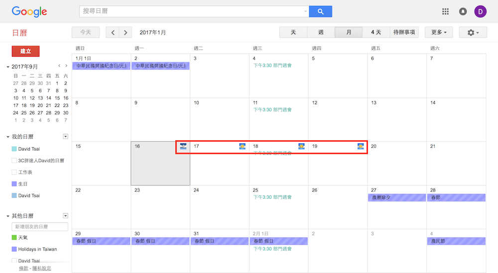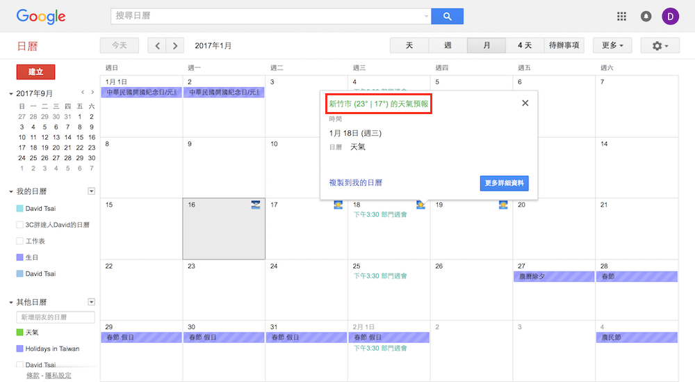 當完成 Google 日曆的氣象設定,並儲存所有設定值後,請務必回到 Google 日曆首頁看看是否有正確顯示出未來三天的天氣預報。而天氣預報圖示會顯示在行事曆的右上方,點擊天氣預報圖示即可查看當天最高與最低氣溫。