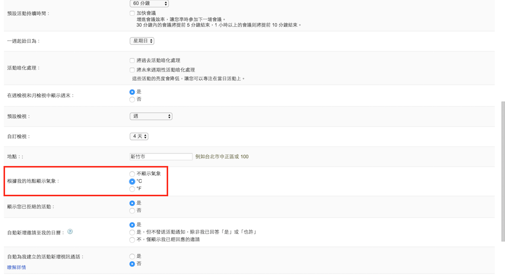 地點下方的「根據我的地點顯示氣象」共有兩種氣溫單位,請直接點選自己習慣的氣溫單問。若不想在 Google 日曆上顯示氣象資訊,可以勾選不顯示氣象。