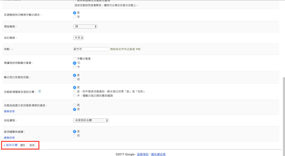 當目前所在地的「地點」,以及攸關是否會正確顯示氣象資訊的「根據我的地點顯示氣象」都設定好後,請直接點選 Google 日曆設定頁面最底層的「儲存」按鍵,這麼一來上放設定的兩個功能才會正確儲存。