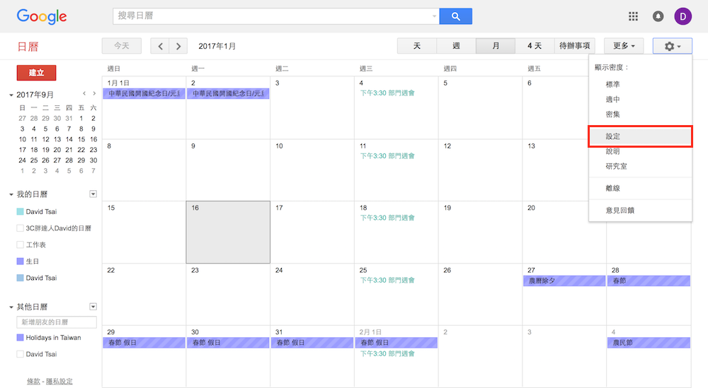 開啟 Google 日曆後,請直接點選頁面右上角的齒輪圖示,並選擇「設定」功能。