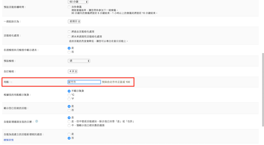 第三步 – 進入 Google 日曆設定頁面,在地點方塊中輸入所在地
