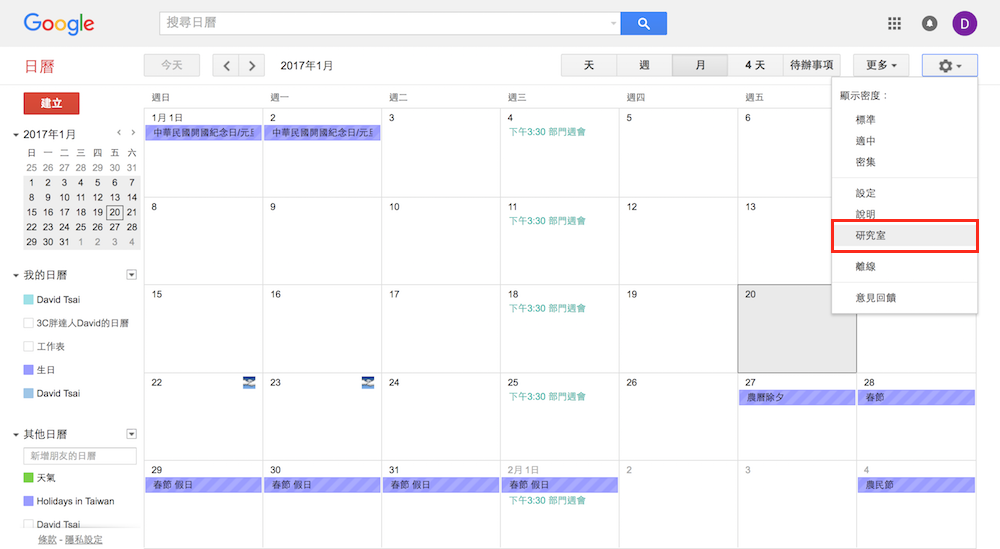 透過 Chrome 開啟 Google 日曆後,請點擊右上角的齒輪圖示,接著選取「研究室」功能,即可進入下個步驟。