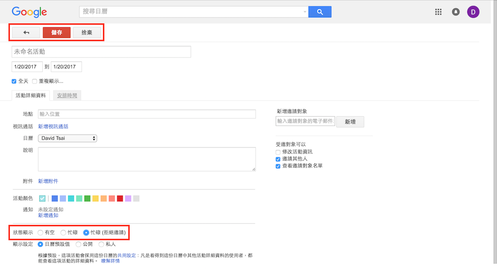 第三步 – 編輯活動,並設定為忙碌 (拒絕邀請),接著儲存活動