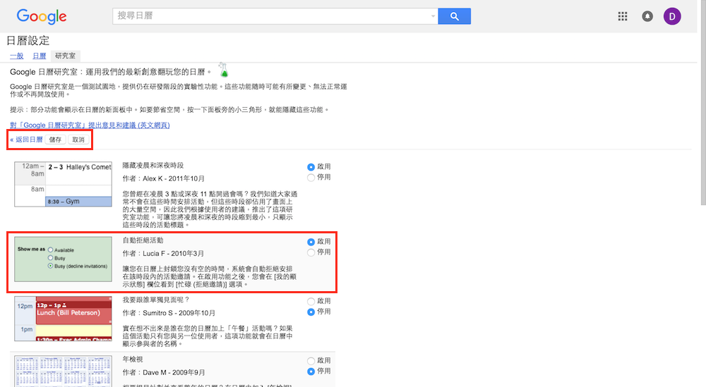 當頁面進入Google 日曆「研究室」後,請找到第二個區塊的「自動拒絕活動」,若要啟用,請直接點選右側的啟用。接著再點選研究室頁面最上方或最下方的「儲存」按鈕,即可儲存「自動拒絕活動」啟用設定。