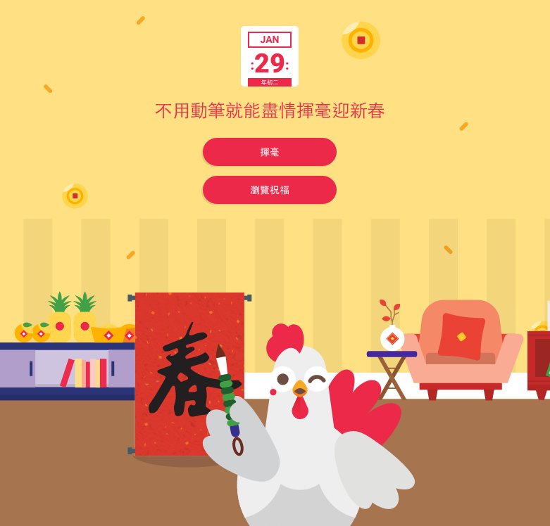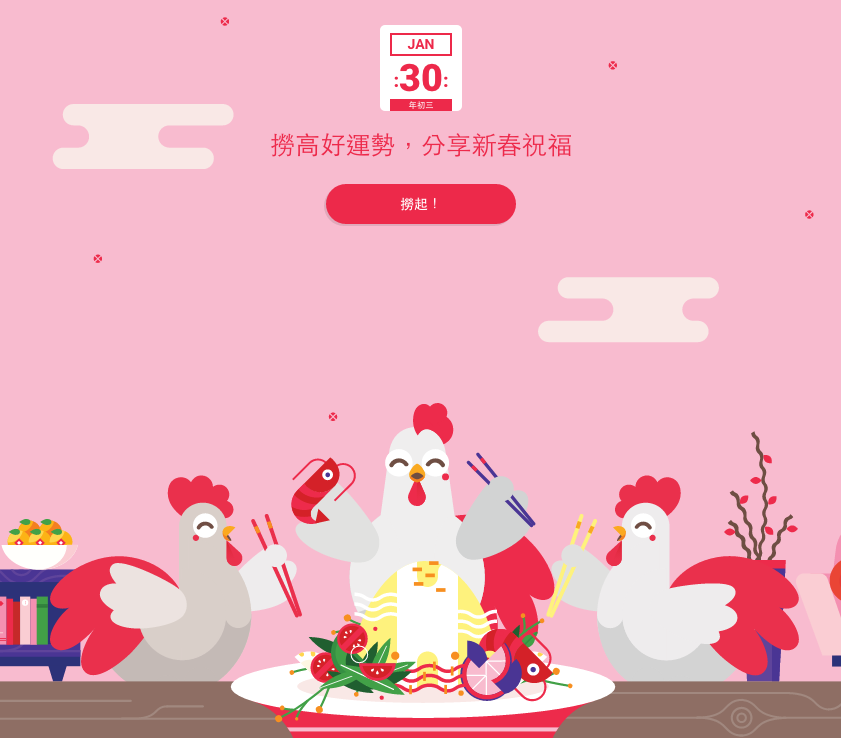 從年前到元宵節,「Google 歡喜迎金雞」賀歲網站以「過年大掃除」、「好運團圓飯」、「歡聚舞長龍」、「揮毫迎新春」、「撈起撈喜」、「祈福天燈」等活動,在過年期間持續帶給使用者豐富、趣味的互動遊戲,增添年節氣氛。