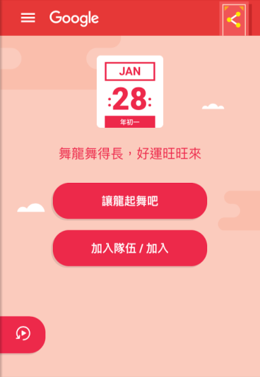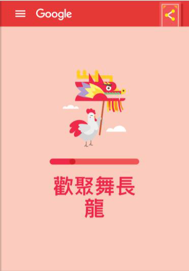 大年初一是許多親友團聚的日子。在這一天,Google 也以適合多人一起玩的「歡聚舞長龍」擊鼓遊戲,替這個熱鬧的拜年日增添樂趣;同時也幫使用者趨吉避凶、帶來好運!遊戲中,玩家可選擇開啟舞龍團並邀請家人親友透過輸入代碼加入團隊,或直接加入親友已開好的舞獅團;遊戲進行時,每人各司其職隨著音樂節奏敲打著各自負責的色球,與團隊成員一起協力讓龍起舞!這款創新的多人同步互動手機遊戲,不僅緊張刺激,更可藉由團隊的力量,把龍舞得更長、更起勁!