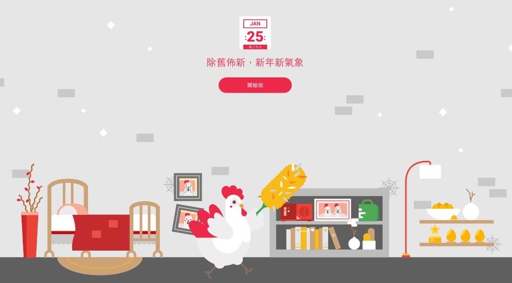 農曆年前,不免俗的一定要除舊佈新,掃去過去一年的不順利、迎接新年新氣象。首發上線的趣味短片將預告主角金雞的新任務,也邀請使用者一起大掃除、迎新春!