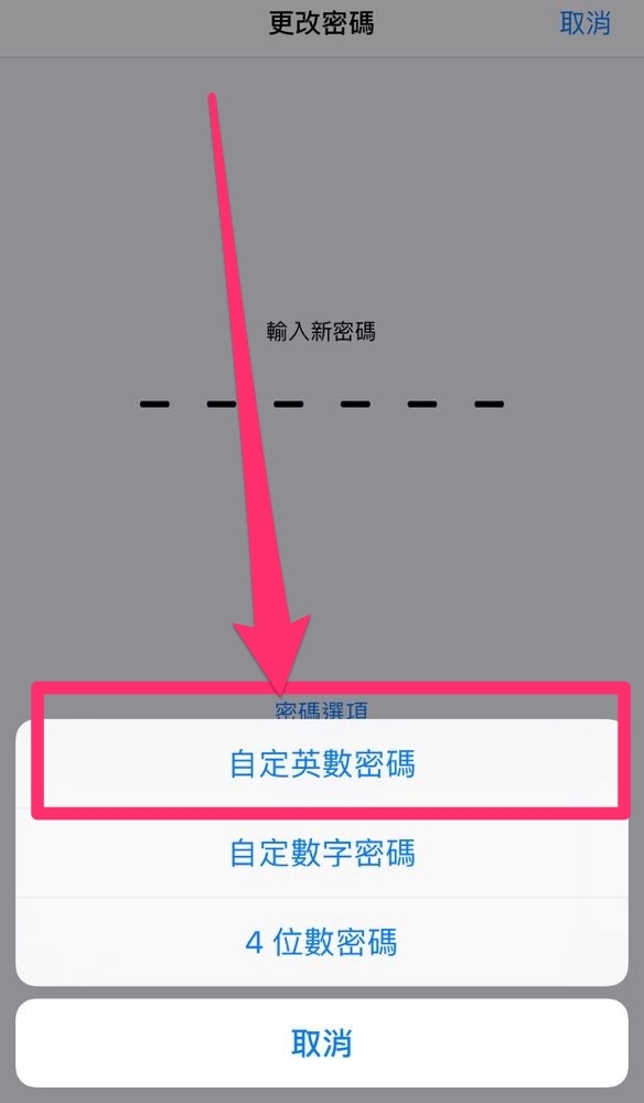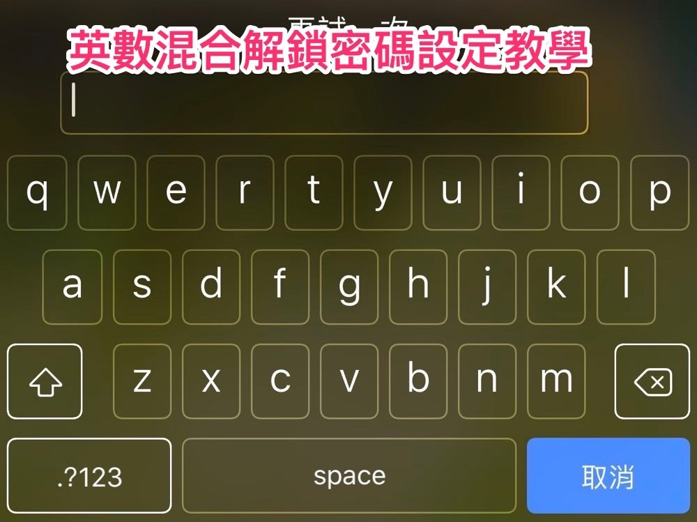 共有「自訂英數密碼」、「自訂數字密碼」與「4 位數字密碼」三種選擇,這時若是選擇「自訂英數密碼」,點進去時會先要求你輸入原先的密碼,當確認身份無誤,便能看到英文鍵盤出現在下方,是的,這時候就可以開始輸入想要的英數密碼組合了唷!