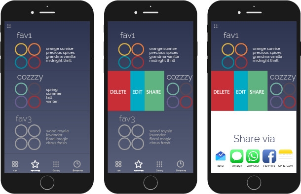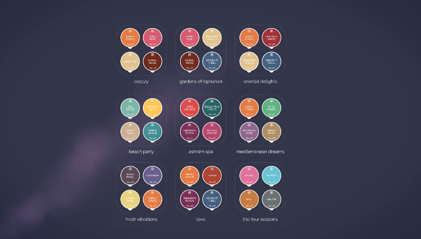 Moodo 募資計劃中將有 6 種不同的香味組合,包括了 Cozzy、 Gardens of Isphahan、Oriental Delights、Beach Party、Ashram Spa、Fresh Vibrations 提供選擇,未來也會推出 Love、Four Seasons 與 Mediterranean Dreams 三種香味組合。