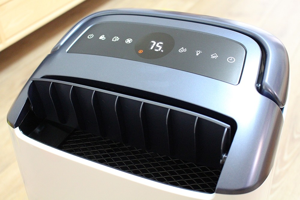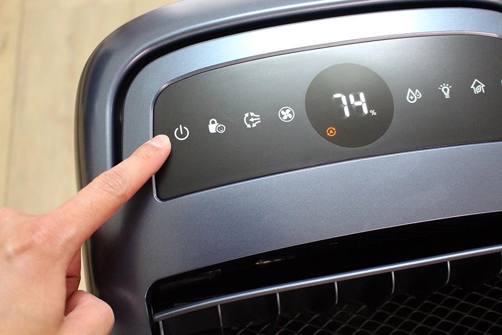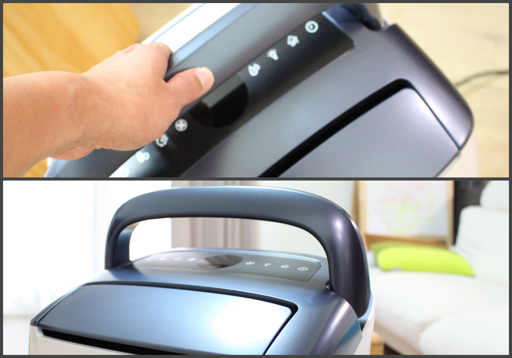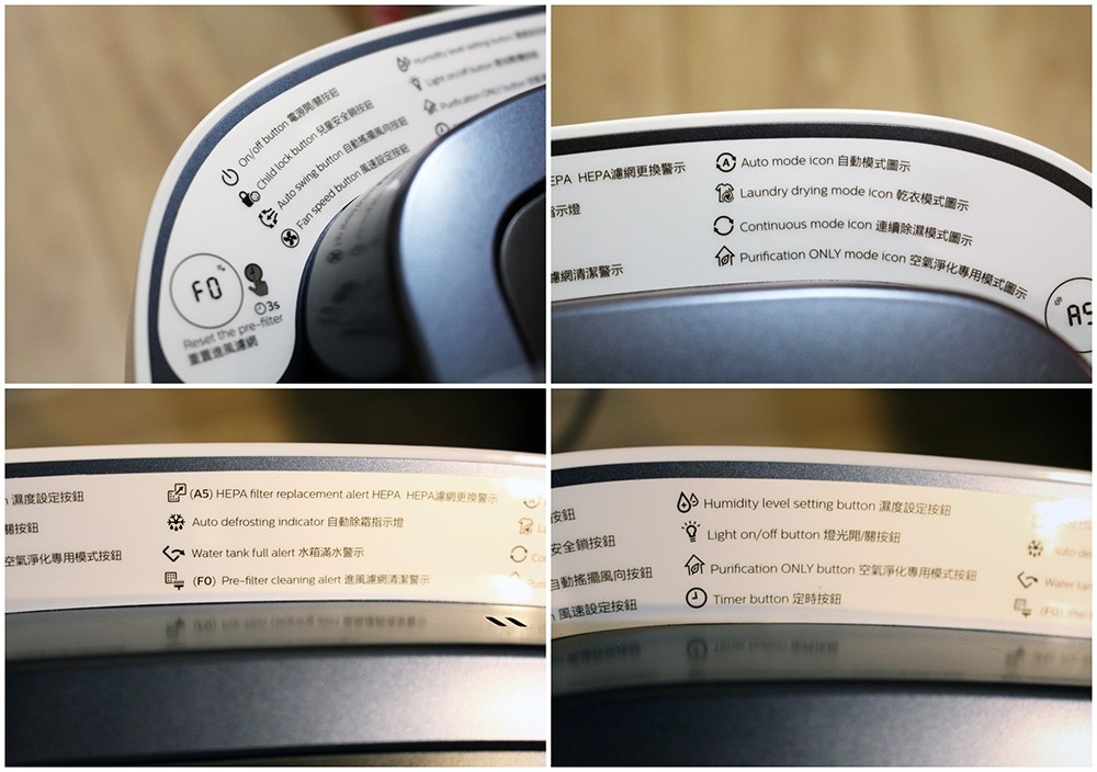 這裡一定要聊一下飛利浦抗敏清淨除濕機的觸控面板,我覺得設計得簡單又好用,用簡單的 icon 就能表示這是什麼樣的功能,中間有個圓形簡潔的只是螢幕,讓使用者很快知道機器運作的狀況以及家裡的相關濕度數值。這指示從左到右分別是電源開關、兒童安全鎖、自動風向、風速設定,右半部的圖示則分別代表濕度設定、燈光開關、空氣淨化專用模式、定時,友善的介面真的用幾次就能完全掌握了。