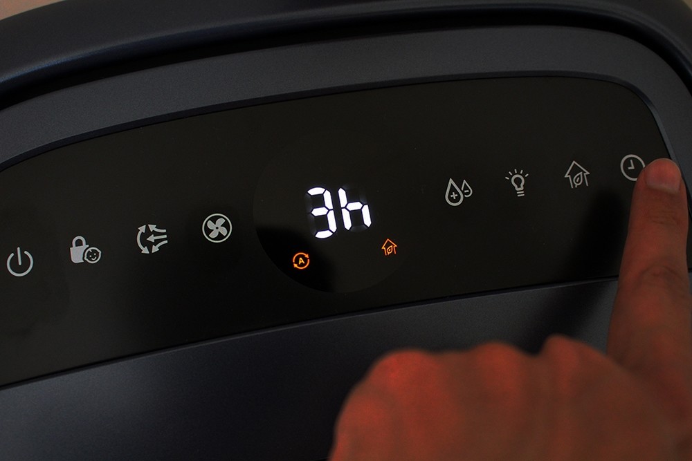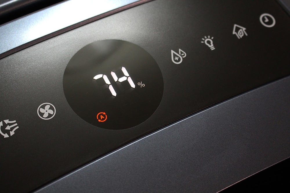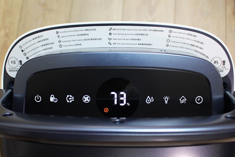 中間的顯示螢幕會告訴你目前現在的空氣狀況,中間數字代表目前室內濕度,左下角紅色的 A 代表自動模式,這個模式下就是除濕同時清淨,另外像是有相關濾網更換警示、水箱滿水通知、空氣淨化模式等標示都會在這邊出現。