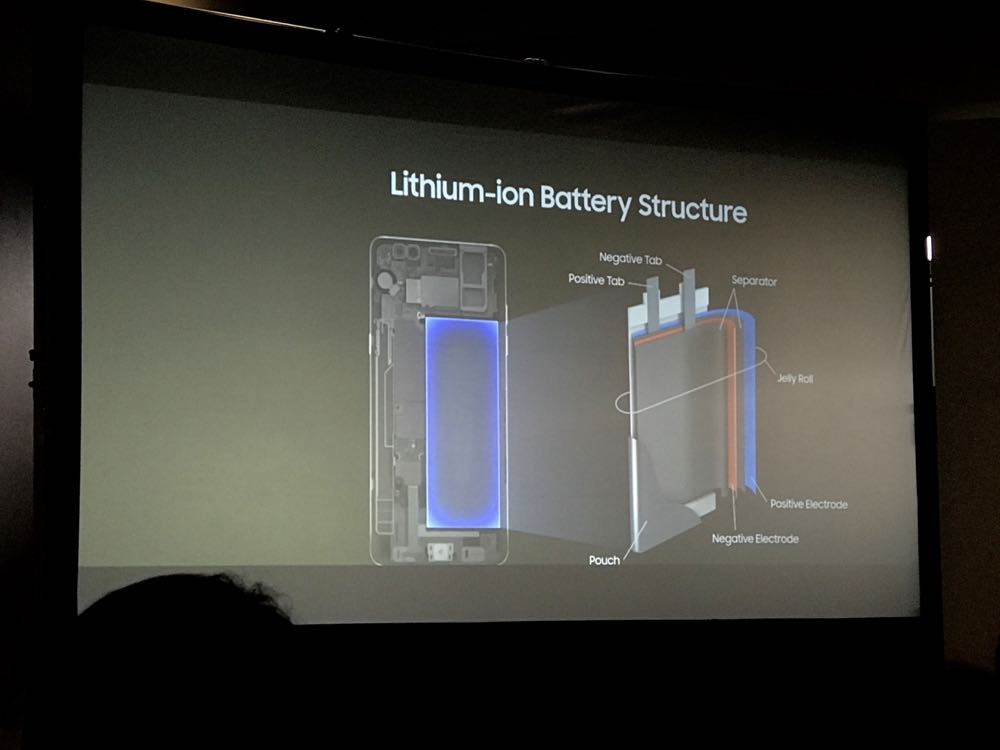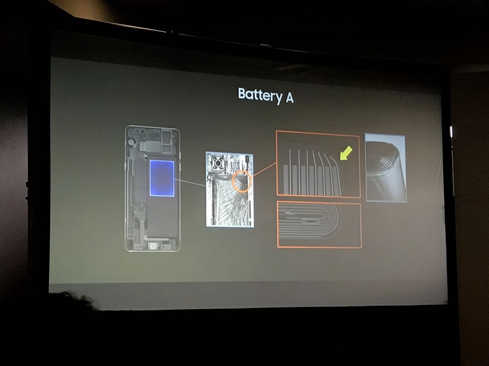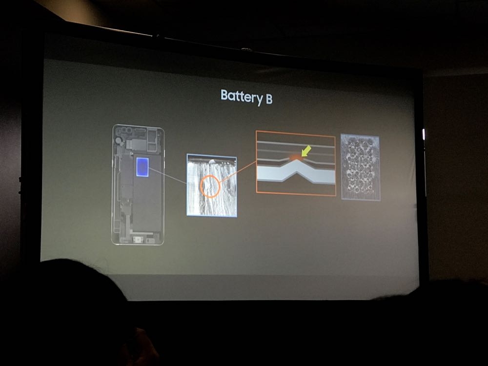 在說明會中,三星也公布了前後兩批召回的電池,分別是由於第一批的內部電池隔離膜在右上角轉角處過薄,造成短路與變形以及第二批電池缺少絕緣膠帶與設計上提高了內部短路的風險。