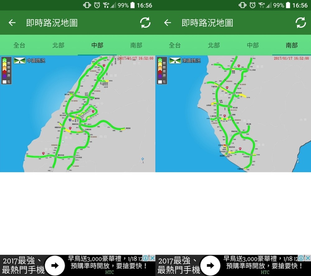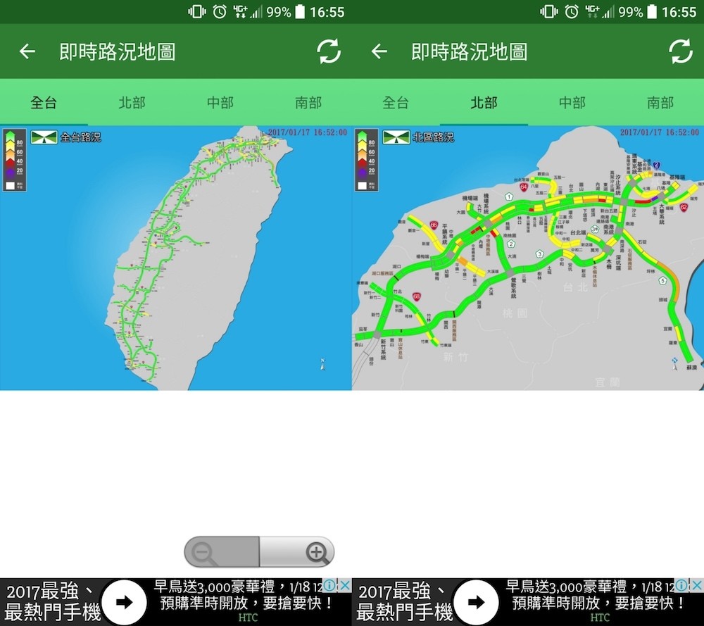 除了即時路況影像檢視外,國道路況即時通還提供即時路況地圖服務。不管是全台一起瀏覽,還是要縮小範圍,以北部、中部、南部的方式來檢視,都可以隨駕駛朋友的檢視習慣來進行調整。