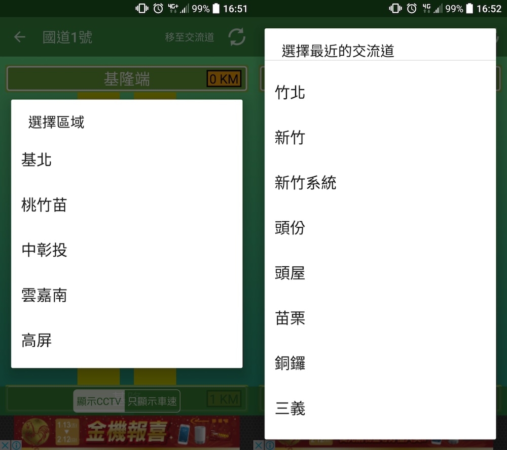 為了讓駕駛朋友可以縮小檢視範圍,國道路況即時通還提供區域選擇服務。駕駛朋友可以先檢視臨近的交流道車流狀況,或是請副駕駛提前檢視準備離開的交流道出口車流狀況,若遇車流量較多,可事先避開,讓旅程可以通行無阻。