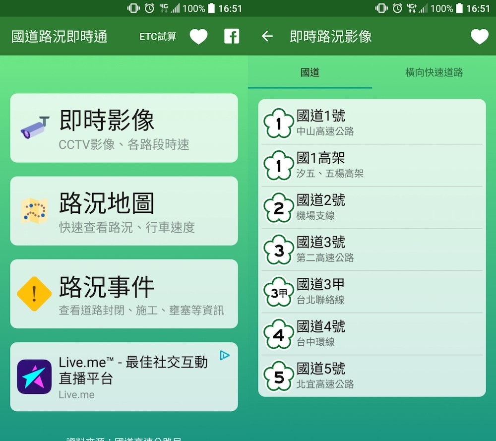 國道路況即時通除了可以檢視國道的即時路況影像外,就連所有橫向的快速道路也可以檢視。簡單來說,無論是高速公路還是快速道路,都能透過國道路況即時通的即時路況影像服務來檢視車流狀況。